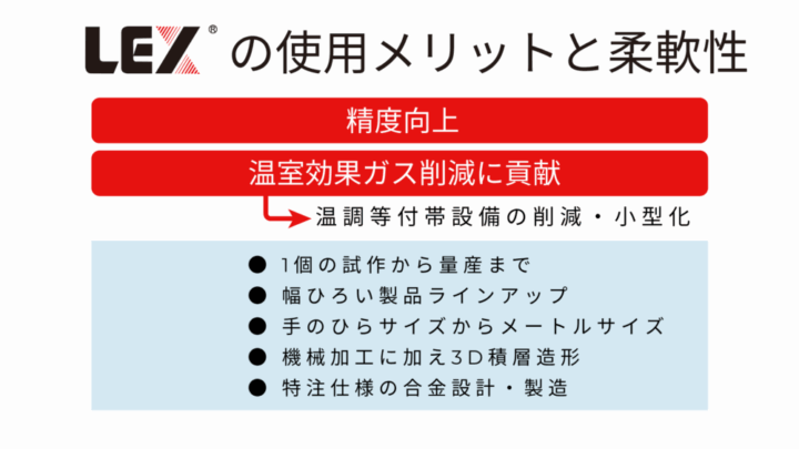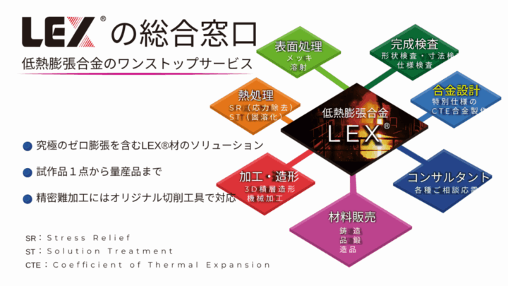 ラスト数ナノの精度向上に貢献する、ゼロ膨張を含む 低熱膨張合金「LEX®」。鋳造品、鍛造品の多彩な製品ラインアップと、機械加工から3D積層造形に至るまでのワンストップサービスを提供します。半導体から航空宇宙・防衛分野に至るまで幅広い領域で活用されており、手のひらサイズからメートルサイズまで対応可能です。お客様仕様の熱膨張係数(CTE)で合金設計製造も可能です。