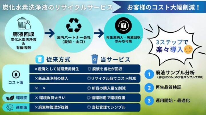 当社では、国内パートナー企業と連携し、お客様の廃液を高品質な再生洗浄液として安価にお返しするリサイクルサービスを提供しております。